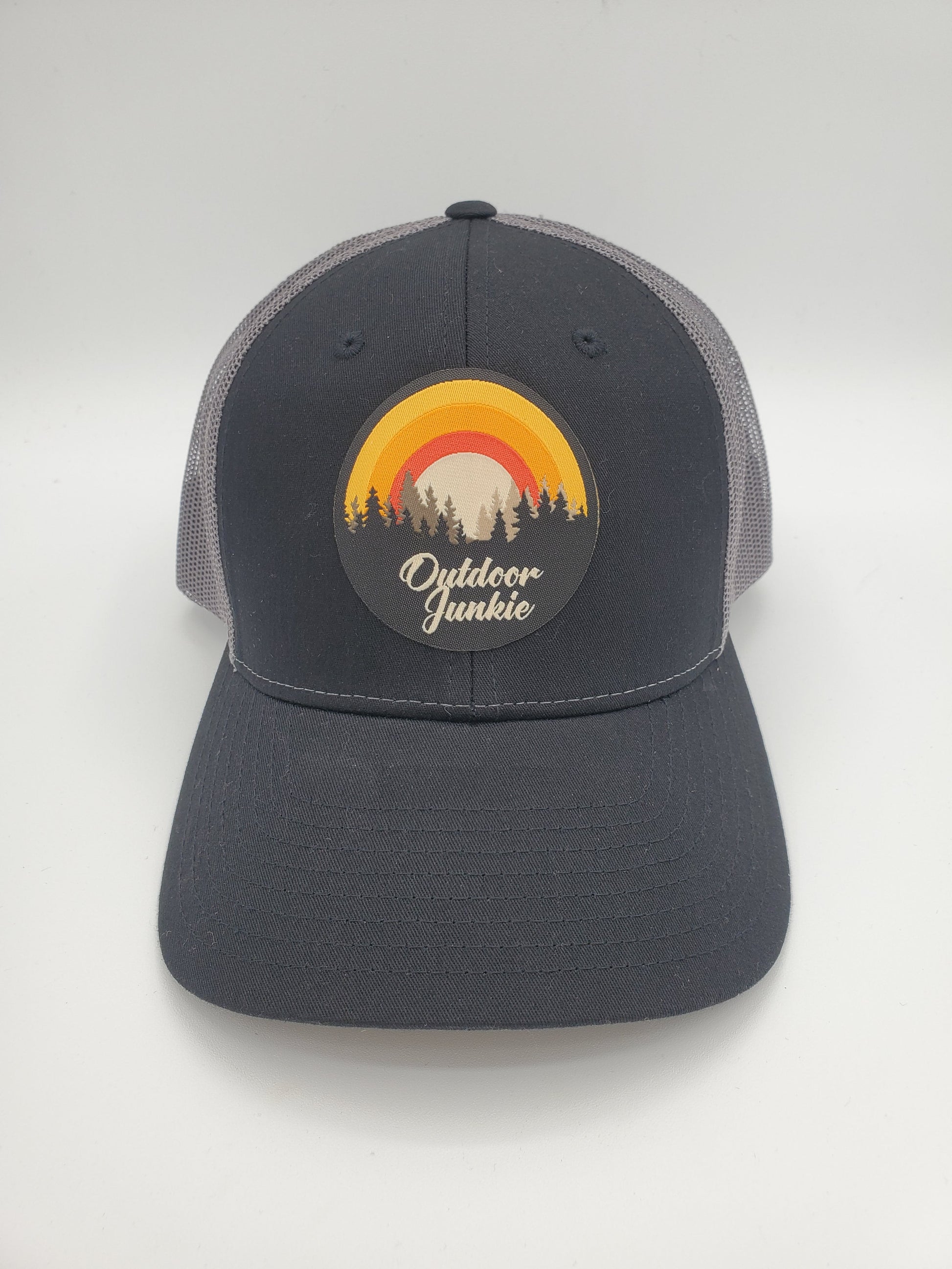 "Outdoor Junkie" Design Trucker Hat (Charcoal Mesh/ Black Fabric)