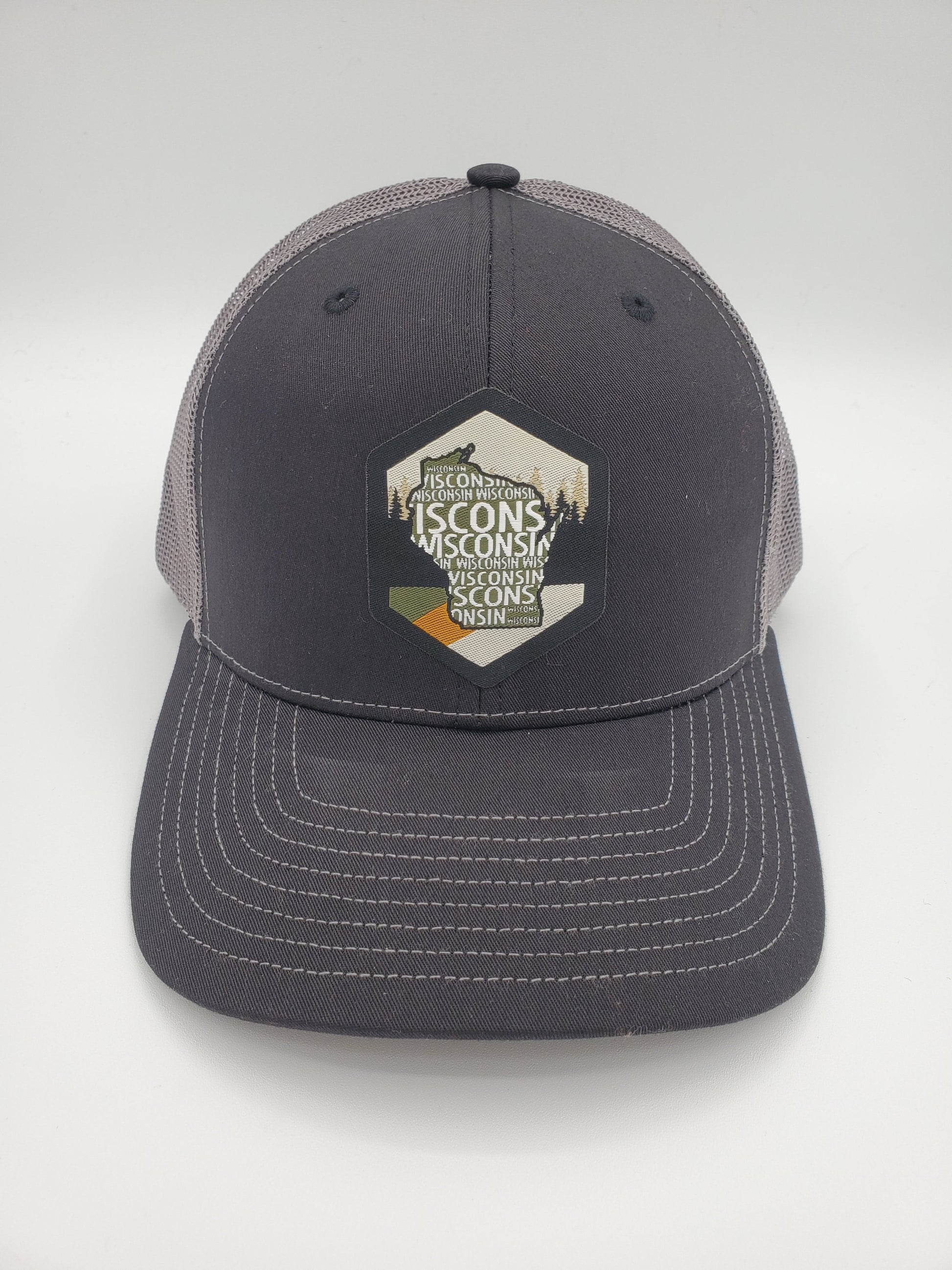 "Vintage Wisconsin" Design Trucker Hat (Charcoal Mesh/ Black Fabric)